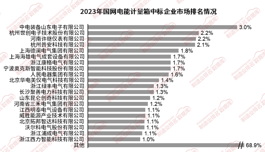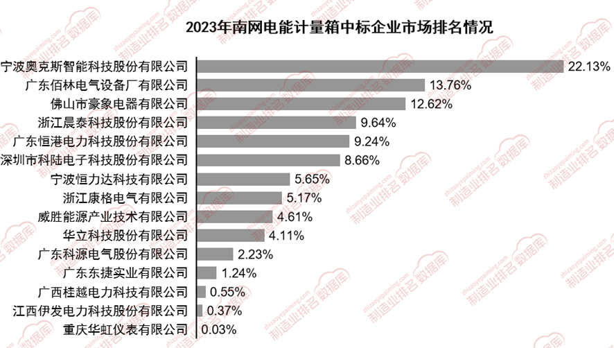 宁波奥克斯智能科技股份有限公司以约1.2亿元的中标金额独占鳌头,其市场份额高达22.1%,成为南网电能计量箱市场的领头羊。