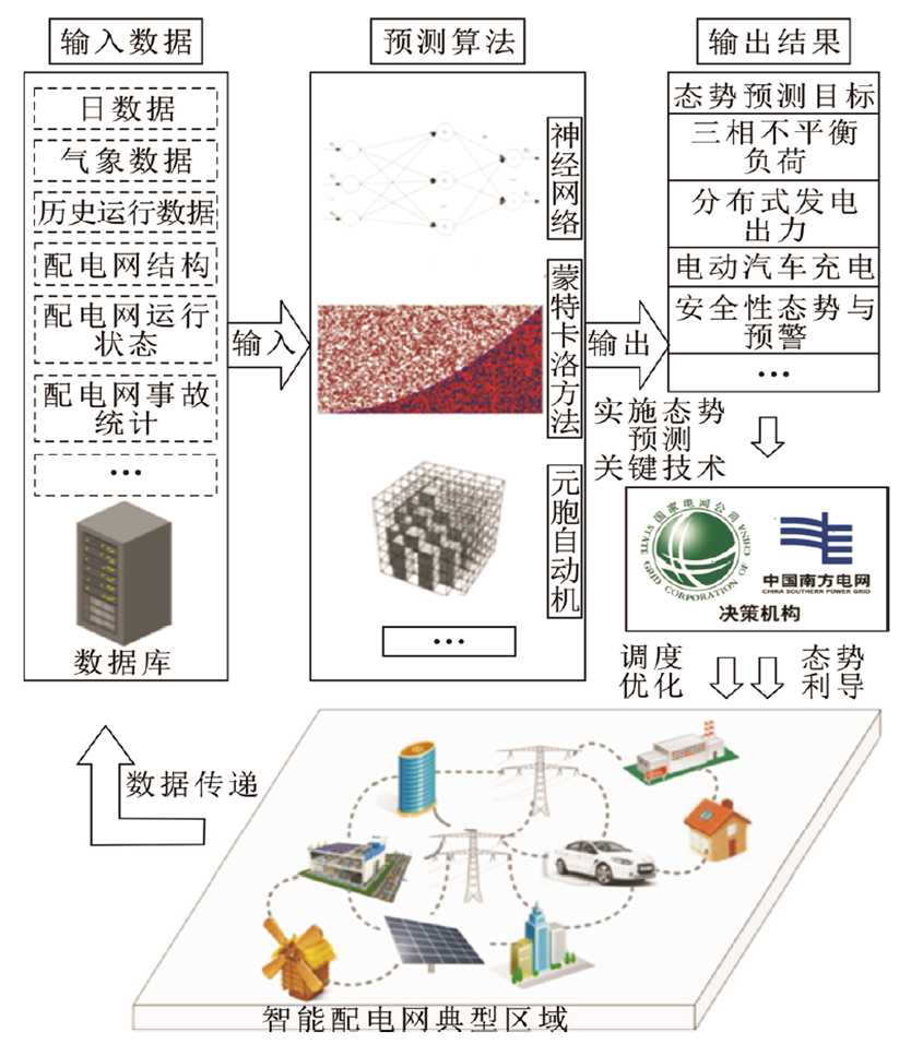 态势预测是状态预测阶段,用于预测智能配电网状态的未来变化趋势,例如不确定性负荷、分布式电源和电动汽车的功率预测;同时态势预测可以实时评估配电网络的运行风险,并提醒配网管理部门及时做出调控,其架构如下图所示。态势预测主要关键技术包括:三相不平衡负荷预测技术、考虑不确定性的分布式发电出力预测技术、基于大数据的电动汽车充电预测技术、分布式能源规划技术、配网安全性态势预测与预警技术。