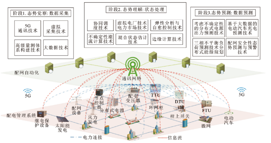 态势觉察是数据获取阶段,该阶段获取智能配电网分析和调控所需的数据,从深度和广度两个层面实现对智能配电网的全面感知,其架构见下图。态势觉察主要关键技术包括:大数据技术、5G 通讯技术、虚拟采集技术、高级量测体系构建技术等。