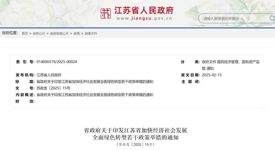 2月15日,江苏省人民政府印发《江苏省加快经济社会发展全面绿色转型若干政策举措》,提出以“2035年前建成绿色低碳循环发展经济体系”为目标,从产业、能源、基建、技术到消费,全链条推进绿色转型。这一政策不仅是江苏落实“双碳”战略的纲领性文件,更是全国首个落地的省级系统性绿色转型方案。
