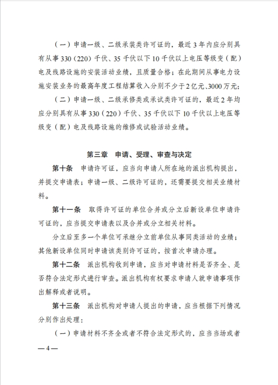 一是完善立法依据,细化许可范围。总则中增加《中华人民共和国能源法》作为立法依据,对承装、承修、承试电力设施的定义进行细化,进一步明确承揽发电项目升压站、外送线路等涉网工程需要取得许可证。