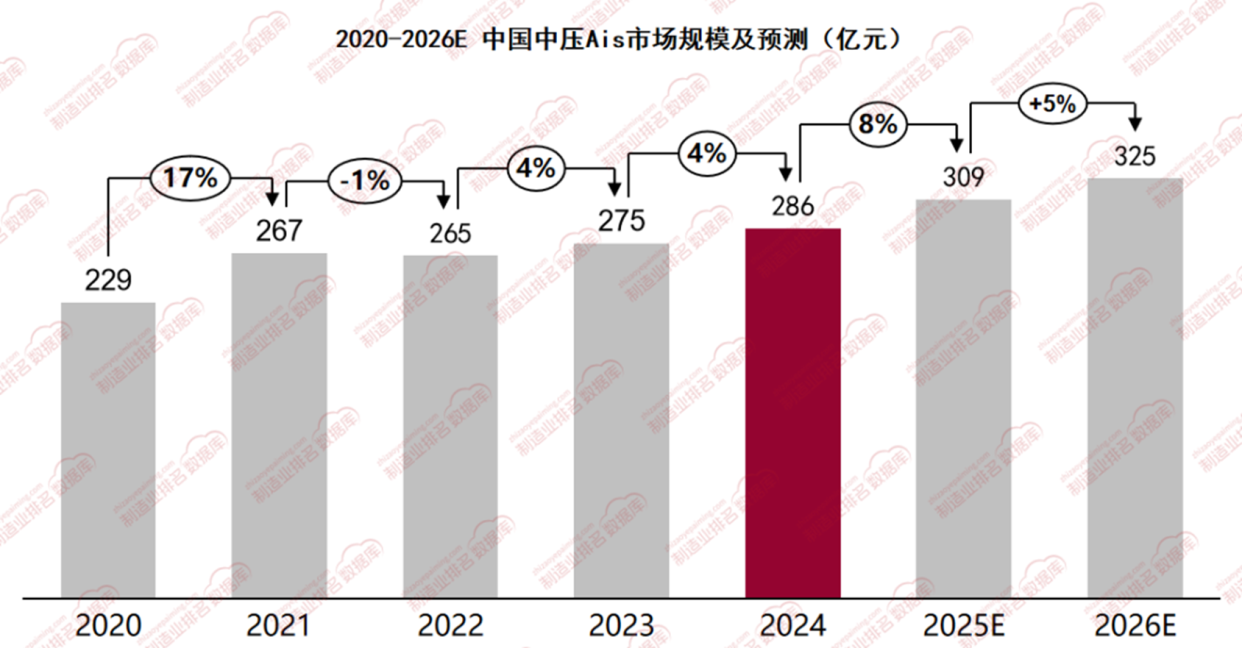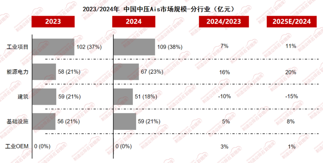 2024年中压Ais市场呈现持续增长态势,市场规模约286亿元,增长幅度约4%。整体来看,数据中心、新能源、石油石化、核电等行业大项目拉动整体市场需求增长,但由于市场竞争更加激烈,Ais价格战严重,导致整体市场规模增速有限。未来2025年数据中心、新能源行业将继续保持高增长趋势,并且智能电网建设、石油石化、电力电子、传统发电以及出海市场的稳定增长,将推动Ais市场持续增长。
